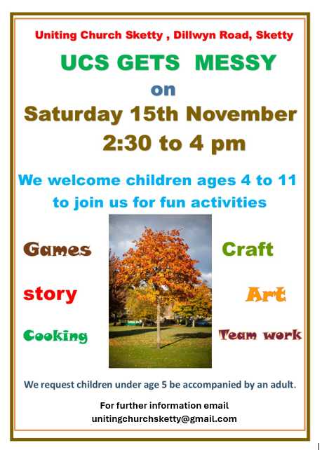 For children 4-11years,Children under 5 must be accompanied by an adult. For more information contact Linda email unitingchurchsketty@gmail.com